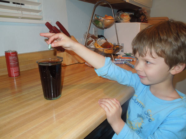 I caught this test on video. June dropped three Mentos into water, then quickly fished them out and dropped them into a cup of Coke. They worked well.