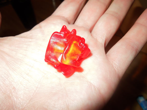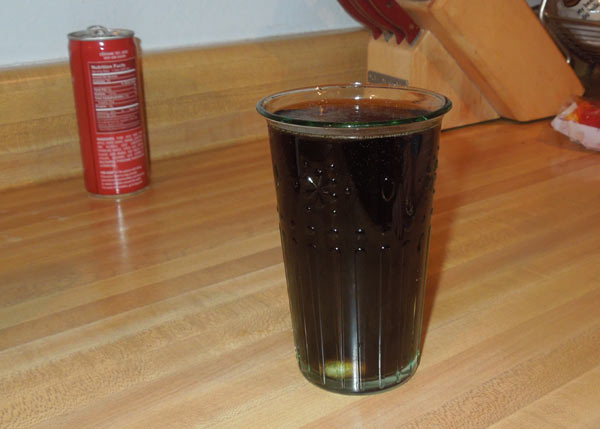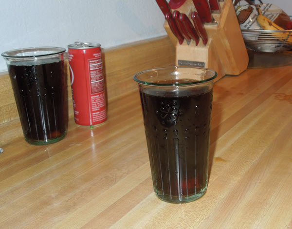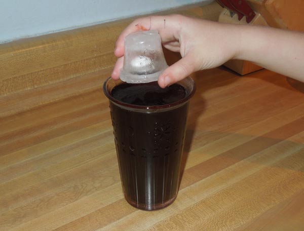 Despite every other time-release method falling short, I couldn't see how these were going to fail. Armed with a fresh glass of Coke, we dropped one in! It floated magnificently, quickly melting in the uncooled Coke. It fizzed quite a bit as the shell was breached and Coke began to seep inside. Ideally, the bottom would have melted first, dropping the dry mentos right to the bottom of the glass, but it didn't always work that way (we tried twice). The shape of the ice cube rotated on top of the coke, finding a new center of gravity as the lower section melted.