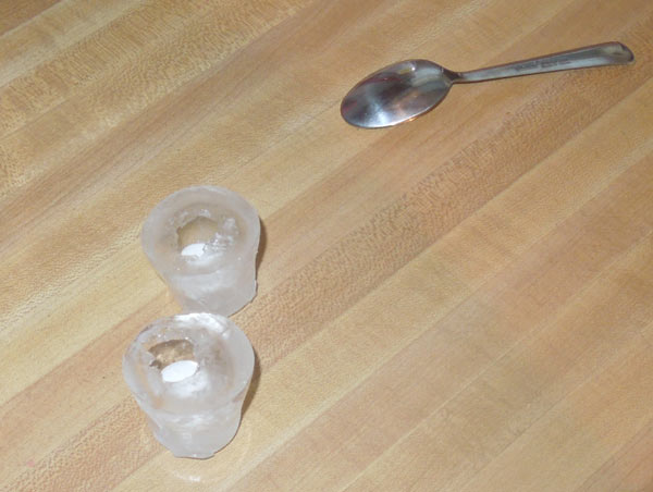 I started with the hollow ice cube scheme, because it would take the most freezer time to execute. I filled a few shot glasses with water, gave them about an hour to freeze on their perimeter, then cracked the top and poured out the remaining water. Then I put them back into the freezer.