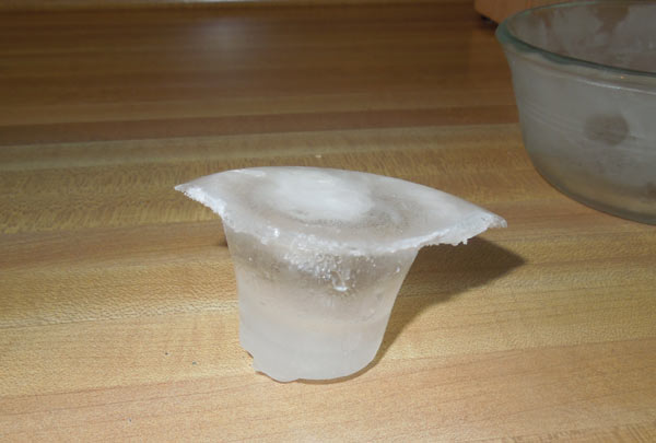 After this tiny ice cup was rock solid, I dropped a mentos into each and inverted them onto a shallow bowl of cold water. If executed properly, this would seal the top of the cup. I consider myself something of an ice craftsman, having triumphed over adversity in creating the frozen six-pack holder.