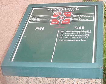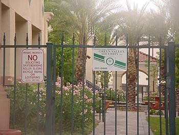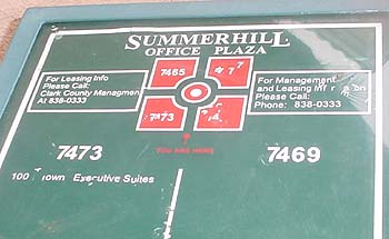 Hello again, Rob!I noticed you had another Las Vegas Spam address listed of your website. Jacky and I just got home from our trip. I was expecting another UPS Store so I did a reverse address look up on the Internet and I was pleasantly surprised to find out that it wasn't. We packed a lunch and headed out to the 'nice' part of town. Trust me, this is the "shit don't stink" side of town. We knew we would seem out of place and Jacky even mentioned she'd be the only black person for miles and miles. With me driving and Jacky navigating, we found Web Marketing, Inc. It's in a four-building office complex...a four-building *gated* office complex. Foiled again!! Here we were thinking we would get some great pictures, but the big "No Trespassing" sign made us feel less than welcome. Web Marketing, Inc. apparently doesn't like guests since they aren't even listed on the directory. We *know* someone was up there, though - their lights were on. We snapped a few pictures right as someone was exiting the office directly downstairs from them. We looked suspicious and the guy watched us from his truck as we drove away. I just know we will hit the "big one" one of these days so we'll keep checking the site for any more Las Vegas spam addresses! ~Megan & Jacky~ The Ambiguously Gay Duo/Las Vegas Spam Control Team |