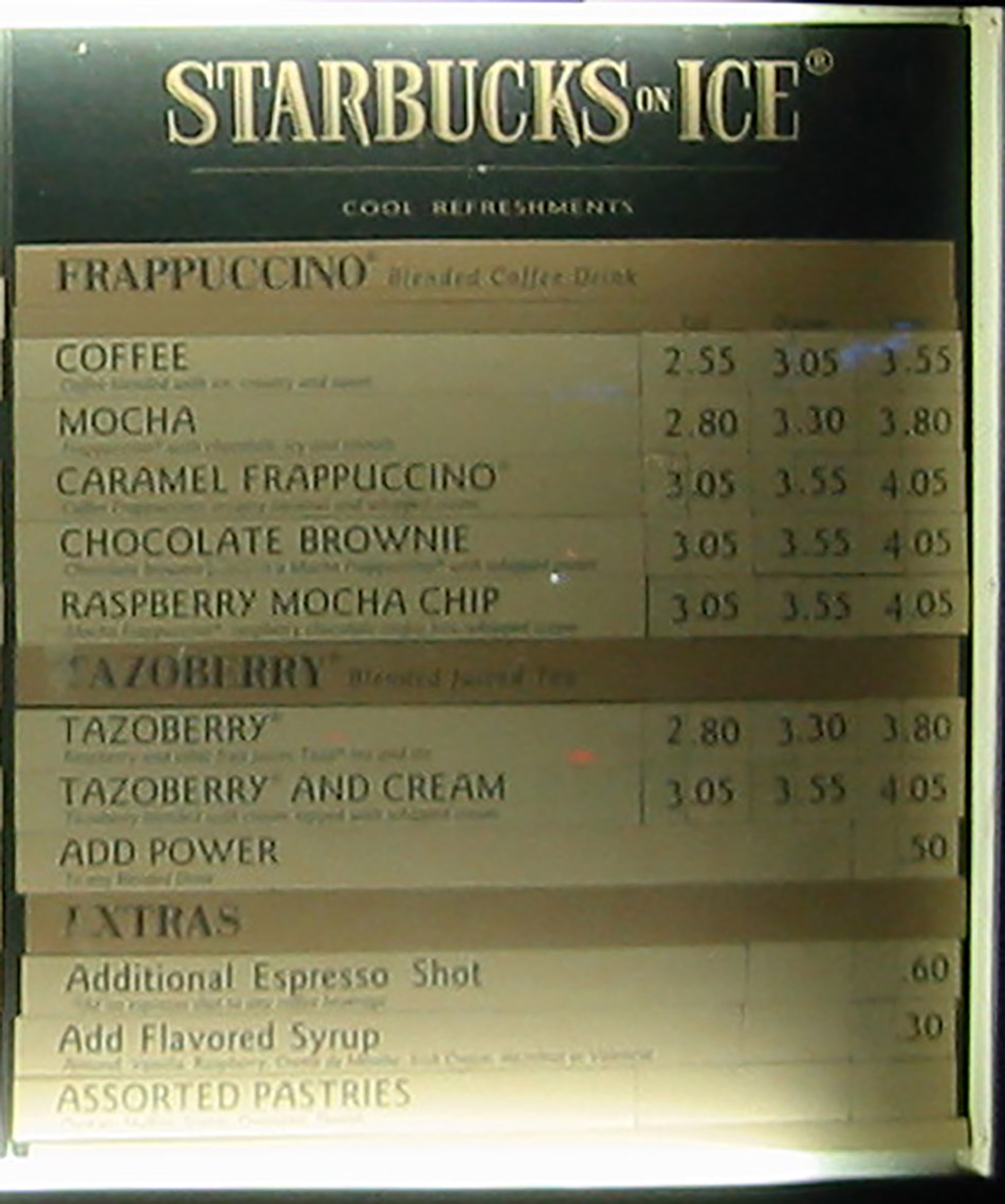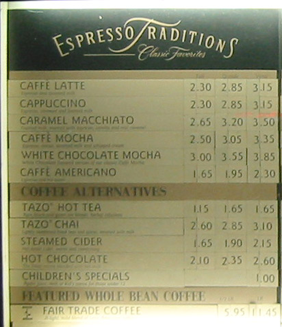 In 2001, I snapped this photo and thought it would be neat to have a photo of a drive thru menu for Starbucks because it was weird. In 2001 coffee shops didn't typically have drive thrus. This drive thru menu stands out because it isn't backlit. It is just a paper menu with a long fluorescent bulb along the bottom. That font and color scheme makes it look even more like something out of the 1930s. There were no product photos on the menu.