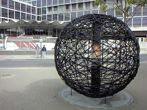 On Friday Tara was off, so I went to the post office and did some restricted sightseeing. I needed a day of rest. Eric did his laundry at the hostel, but they only had one washer, so I figured I would do it later. In the morning I took a picture of some fire trucks, the Belfast Titanic memorial and a strange bouy display celebrating the nautical history of the city. I caught two locals pasting posters to a club, and saw more than one Belfast Street mural. I was amazed at all the barbed wire and iron gates in town. I started my laundry and killed time by walking through some scary parts of town that looked more like a war-zone than a slum.