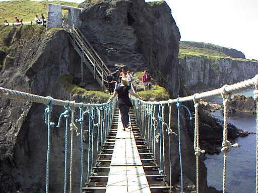 After almost 2 hours we reached the first tour-stop, the northern cliffs and the rope bridge. Steven had a digital camera too, but he was buying memory cards as he filled them up, whereas I brought a laptop and I transfer the files to that. I wondered which of us was the most foolish. We each had a camera, and we took lots of group pictures. We all made it across the rope-bridge, and saw some Irish paddocks of land.