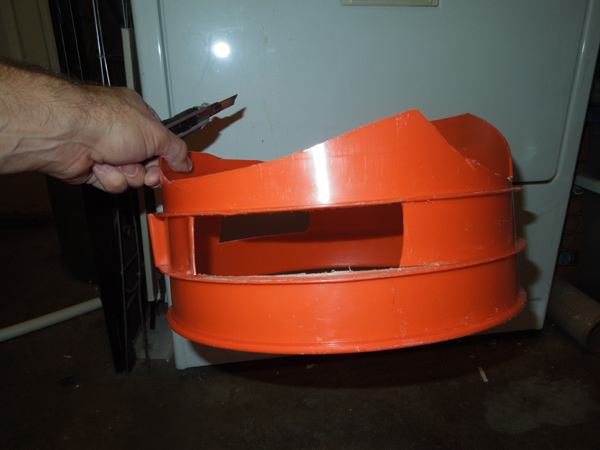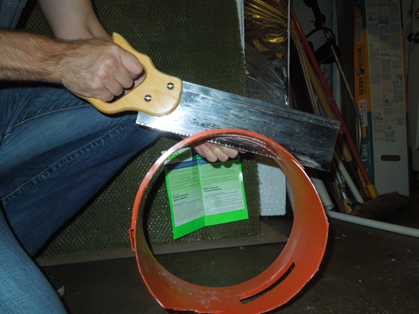 The moving train cars would be visible through this cutaway. The plastic walls of a five-gallon bucket are too thick safely cut with a razor knife.
