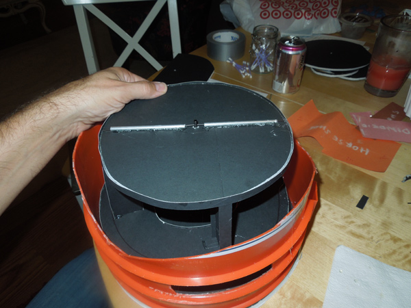 Two tiny aluminum tubes are hot glued to the foamboard. They hold a long metal rod which acts as a cotter pin to hold the turntable to the shaft.