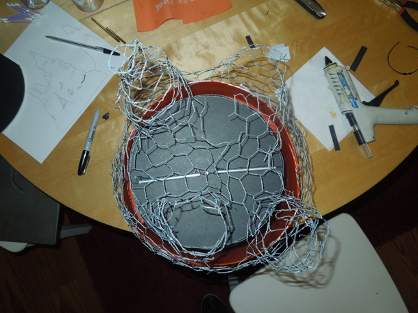 I started with another 5-gallon plastic bucket. Although this mountain would be covered with paper mache, I couldn't rely on an entirely chicken wire construction.