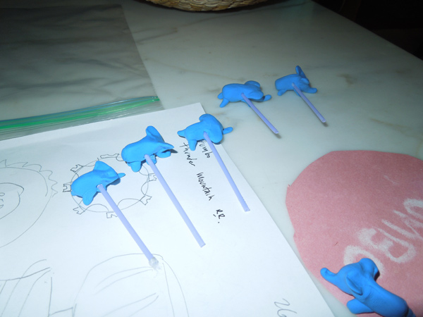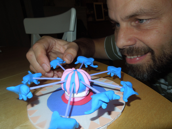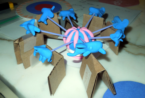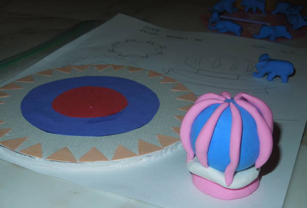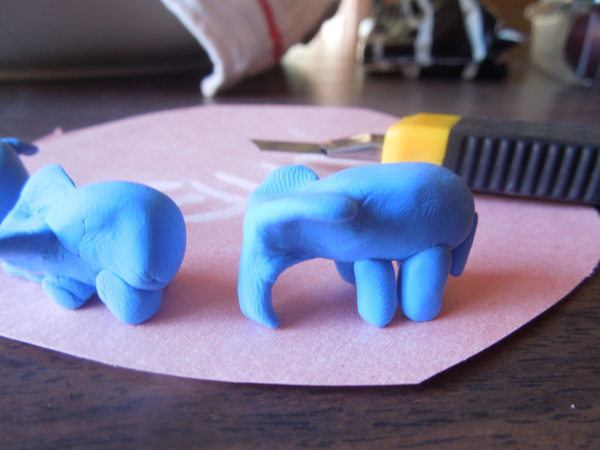 The center ball wasn't dry enough to support these elephants, so I built some little cardboard seesaw supports while it hardened.