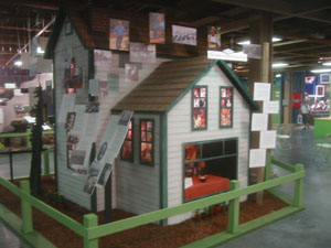 The little house laden with signage. The house suffered a break-in on the second day of the fair. A little kid climbed the fence and busted through the front door and broke it off the hinges. Someone screwed it shut after that. |
