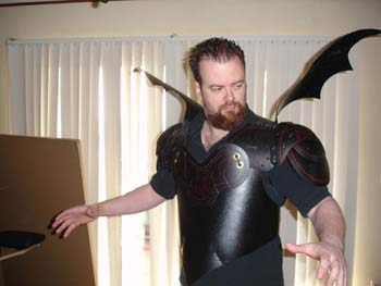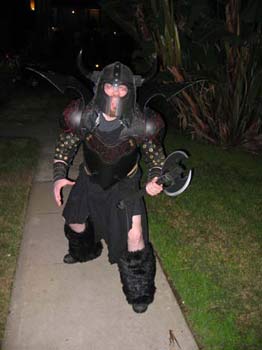 Hey Rob, I've enjoyed your site for a long time and I've been afan of your can-do attitude also. So here's my entry. It's my "Dark Viking" costume idea. The only thing that NOT homemade is the bull horns which I bought off of eBay. The belt and the wristbands. The rest is made from 3 different types of black garbage cans. Using a Dremel tool to cut and shape, bound together with leather straps, screws and grommets. The bat wings were a last minute idea having left over garbage can material after I cut out the chest plate. I doubt I would have been able to properly mount them on my back if I hadn't seen your posting about bending PVC pipe. Using the heatgun I was able to bend the tabs at the base of the wings at a 90 degree angle for easy mounting. So thanks for that. BTW, next time you bend some pipe, fill it with sand first. It keeps the pipe from kinking and makes a smoother bend. The shoulder pads are made from the 'spinner tops' from saidgarbage cans. Cut up and put back together using steel wire. The rest of the outfit was sewn like a Viking would with leather straps ( I can't sew) and the arms were made out of an old leather jacket I bought at Goodwill, cut up and covered with grommets. It took a while but totally worth it. Anyway, keep up the great website. The Reverend David "Cornelius" Johnson Potentate of the 33rd Degree Http://www.DevilPig.com