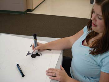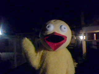 Dear Rob, I apologize for the cruddy, incomplete picture of my costume, but it was taken with a camera phone. I will send a better picture from halloween when I can get my film developed. Basically, the body part of the costume was made of 4 yrds of yellow "fuzzy fleece" which I got at a fabric store. My mom sewed it into a knee-length costume, including wings. The head was constructed of the largest balloon Icould find at Party America - I believe it was something like 40 inches around, or something like that. For the head, I started off with papier mache, which did not hold firm enough to stand up to the finger poking I knew I'd get on Halloween. My boyfriend and I then got rolls of "Rigid Wrap" plaster cloth, which is what I assume is used to make body casts. Using about 8 of the 4''x 180'' rolls made the chicken head hard enough to wear and not destroy. The beak is made out of triangles of cardboard, and for the giant eyes we used paper bowls, then put "googly" eyes on them. A hole cut out between the beak pieces gives me just enough room to see around me. The feet on my costume were purchased from Debbie Lynn's Closet in Sunnyvale, CA, and everybody loved the entire costume together. There must have been at least 20 pictures taken of me as my friends and I wandered from bar to bar in San Jose. A few people thought it would be funny to slap the back of my big chicken head, and amazingly, the plaster held up very well. Vote for me for Chicken Halloween Queen! |
