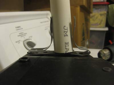 I used two bent pieces of plumber's tape (flexible steel strap) to screw the pvc arms securely to the plastic bottom of the boombox. This strap shape was not ideal, because as the strap weakened under use, it allowed the boom box to flop forward and backward a bit. |