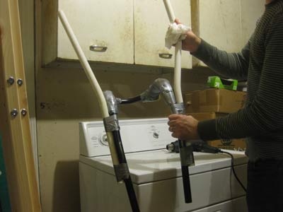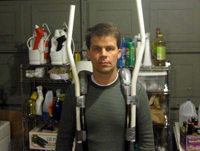 I already had a shoulder harness bent from PVC (plastic) pipe (reused from the Geico money costume). For arms, I added two 30" PVC uprights. They needed a little bend to them, so I threatened them with a heat gun for about 45 seconds and bent in some slight elbows. Normally I would screw these uprights to the shoulder harness, but I used duct tape here for temporary placement. |