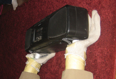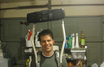 You'll notice that the hands aren't in this arrangement yet. I figured it would be easier to attach the pipes to the box than to attach the pipes to the hands and then the hands to the box. I planned to make the hands out of wire and newspaper, so they wouldn't be a good addition to the actual support structure. Boombox attached. This is already looking like a win! This photo should give you a glimpse back in time to how people used to carry their tunes with before Apple invented the Walkman. |
