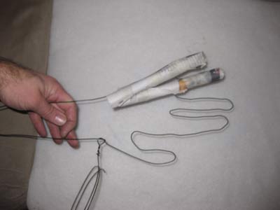 Next up, it was time to make hands. I started with steel wire, available in the concrete and cement block section of Home Depot. I bent up a crude hand-shaped outline. To create thick fingers, I rolled up newspaper into long sausages and taped them into place with masking tape. |