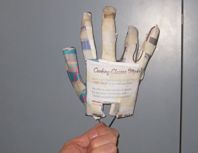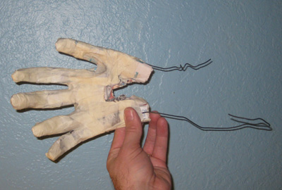 I wrapped the whole hand in masking tape to smooth over rough edges. The hole in the palm is to allow the PVC uprights through. |