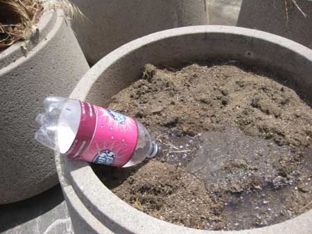 I enlisted a 3-liter bottle and reclaimed some of the water. The soil in the planters was super dry. Maybe I would need some mulch on these. How much water would I need to keep nine planters growing? I would probably need a hose and a pair of locking pliers if I didn't want to haul 10 bottles here every day. The next day, I was ready to plant! |