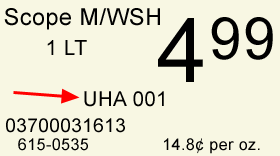 On the Walgreen's pricetags, A few letters sit in the low middle of the price tags. Here, the store paid UHA for a $4.99 bottle of Scope. Other prices showed up on the shelf like this: