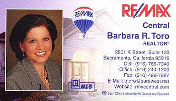 Barbara R. Toro RealtorŪ 2901 K Street, Suite 120 Sacramento, CA 95816 Cell (916) 765-7340 Office (916) 244-1200 Fax (916) 498-7887 Email: btoro@surewest.net Website: rmxcentral.com Each Office Independently Owned and Operated |