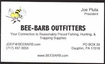 OutfittersYour Connection to Reasonably Priced Fishing, Hunting, & Trapping Supplies Joe Pluta President JoeP@beebarb.com PO Box 39 Dauphin, PA 17018 (717) 497-3059 |