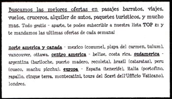 Buscamos las mejores ofertas en pasajes baratos, viajes, vuelos, cruceros, alquiler de autos, paquetes turisticos, y mucho mas. Todo gratis - aparte, te podes subscribir a nuestra lista TOP 21 y te mandamos las ultimas ofertas de cada semana! norte america y canada - mexico (cozumel, playa del carmen, tulum), vancouver, ottawa, centro america - belize, costa rica, sudamerica - argentina (bariloche, puerto madero, recoleta), brazil (cataratas), peru (cuzco, machu piccu). europa - Espana (tenerife), italia (portofino, rapallo, cinque terra, montecatini, tours del Scavi dell'Ufficio Vaticano), londres. this card is also on the business cards on fire page. |