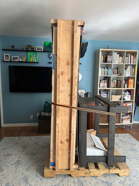 I sent photos to my new shipping agent, asking about height limits and weight penalties, residential driveway pickup, and having a crate which overshot the length of the pallet. He reassured me that everything was fine, but that I should extend the width of the pallet with two 2x4s, so that the crate wouldn't overhang the pallet surface.