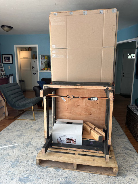 When the delivery truck arrived, I exchanged paperwork with the driver and he checked the address labels I had added to the crate.