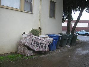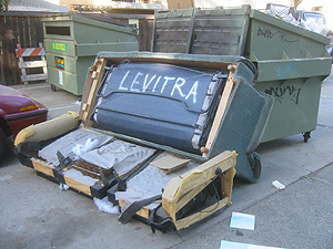Rob, I think I have cracked the Levitra mystery. First off, check out GlaxoSmithKline's website for the definition and press release. Clearly these couches were crying out for help as they'd been discarded because they were no longer firm. They needed the wonder drug to reaffirm their place in their former households. They're crying out for help, man! Oh, the humanity! It's either that, or a stealth marketing campaign for the competitor to Viagra. Love your stuff, and congratulations on the impending half-Cockerham. Cheers, Vince d'Eon Calgary, Alberta |