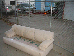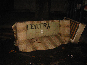 Hi Rob, While reading your story on the spray painted couches, this theory suddenly occurred to me. It might not bear up to much scrutiny, but here's my initial thought: All these couches look like they are in poor shape, and are being abandoned. Could "levitra" be some sort of abbreviated tag, as in "Leave it for trash," for garbage men to know to junk it, and for passersby to know the couch isn't worth dragging home? Sincerely, Brady Richards This sounds like a reasonable theory, but aren't the couches pretty obviously trash as they sit? Or maybe they aren't trash, who is to judge? He wrote back: Okay, well, now that I've done some googling, my theory seems to wilt like some erectily disfunctional male genitalia. I didn't realize it was a drug. I also didn't realize just how insidious it is, appearing in so many goddamn websites. Even if you google paint levitras sign couch garbage, you get 47 results, none of which shed any light. So maybe levitras is just some booming guerrilla ad campaign.