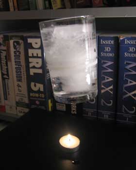 The first chunk of ice was dangled above a desk lamp fitted with an 100-watt incandescent light bulb. This experiment required approximately 30 times more setup effort than the other Cockeyed.com Science Moment melting experiments.