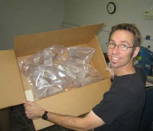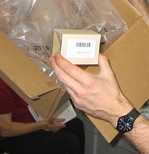 Sometimes the boxes are suspiciously lightweight, which makes everyone in production smile. We smile because the Xerox parts boxes are notorious for underpacking, putting one small component inside a giant cardboard box for shipping. Last Wednesday, Stephen called me back into the printer room to get a few photos of the shipment. It looked like a superb specimen to illustrate underpacking. |