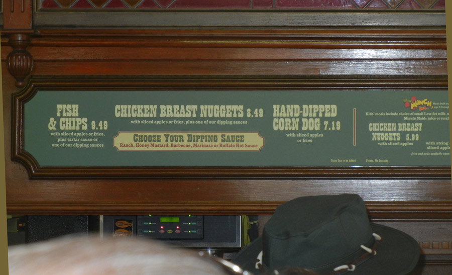 Here is half of the sign at the Stage Door cafe in Disneyland. I remember being appalled at the price of a $7.19 corn dog, but I've enjoyed a few more expensive ones since I took this photo in 2011.
