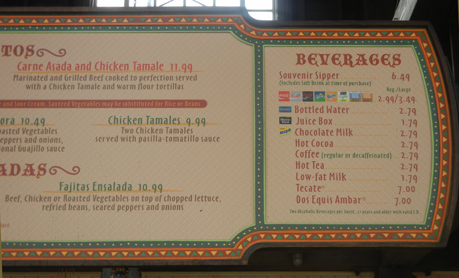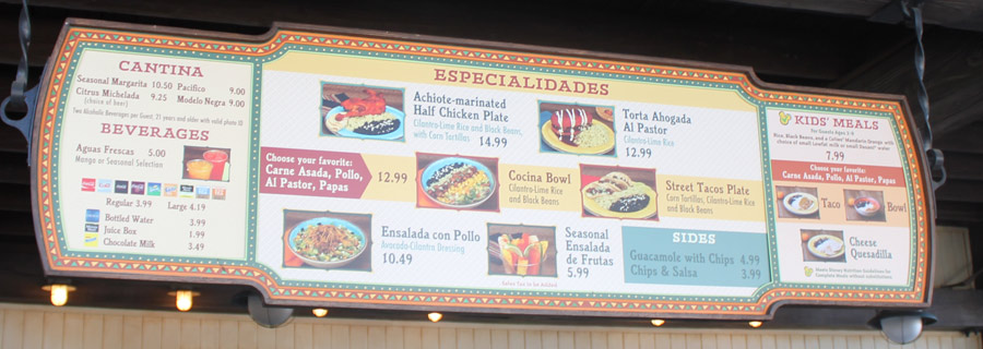 This is half of the sign at Cocina Cucamonga in California Adventure, circa 2011. Meals were $10, $11 and $12. Cokes were $3 and $3.50