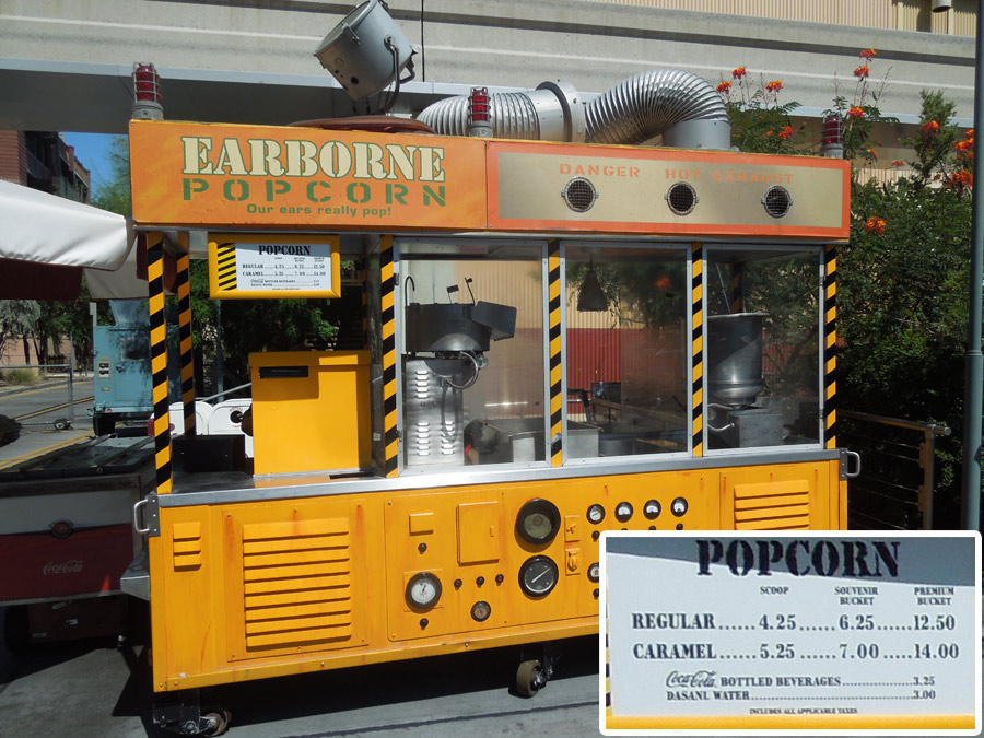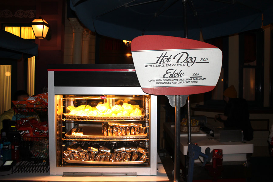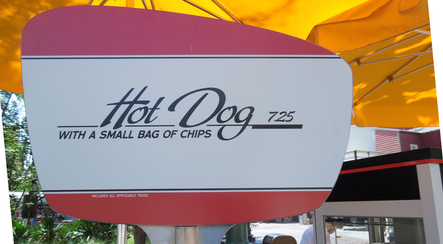 The stylized hot dog sign in California Adventure has bumped up to $8, and now it shares the spotlight with ears of corn for $5.50.