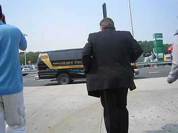 But, that turned out to be just a minor setback. A black car met us at La Guardia and drove us to our hotel in Times Square. We were running low on time, but we were going to make it. This photo is of our driver. We did not board that black A-team van. We crossed the street and got a nice Black Lincoln. |