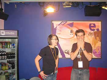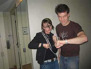 This is an amazing story, and this is how it begins: I got an email from a segment producer at MTV2, asking about including something from Cockeyed in a huge Foo Fighters Special. We got in contact, first with MTV2, then with the Foo Fighters Management, and it was true. They were making plans for a big show, 24 hours of Foo, in support of the Foo Fighters' 5th Album, "In Your Honor". I was invited to help. Wanting to look my best for a national TV audience, I embarked upon an Extreme Makeover. Well, to be honest, I just shaved off my beard. Travel plans were quickly arranged. I enlisted my sister Jane as assistant, and left Stacy home to toil at home with our young one.