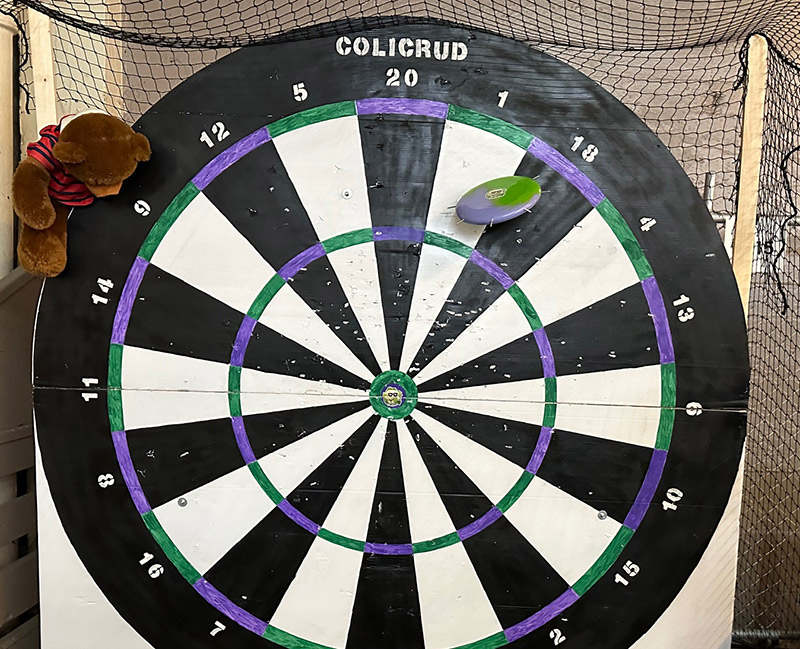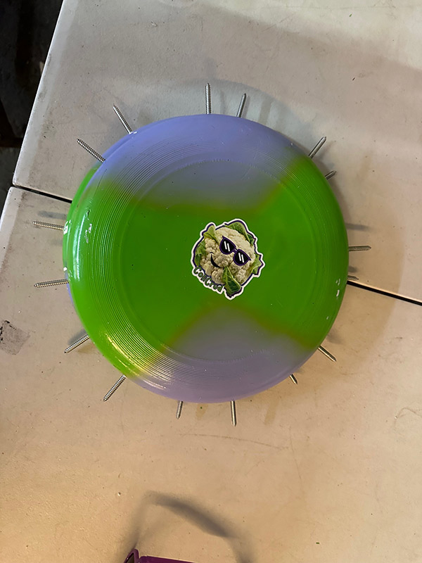 Another favorite was the Colicrud Frisbee Dartboard. This display had a number of frisbees, modified with a number of protruding screws around the rim, facing outward.