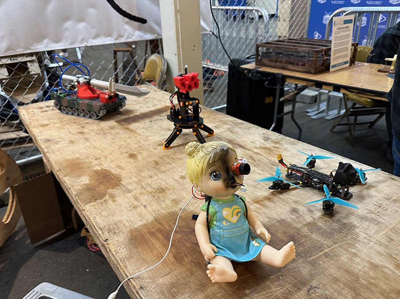 Upstairs there was another "Gallery of Youtube Creations" where the Backyard Scientist showed his gigantic man-size beartrap and William Osman showed off his weaponized toy collection.