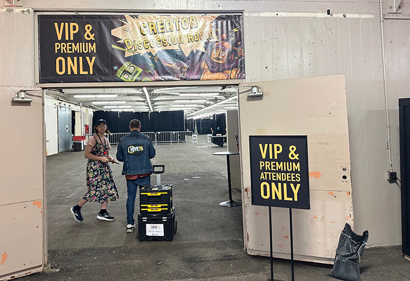 The event space was bustling with exhibitors, who were exploring the event space we set up in earlier in the day, some of us holding beers we had paid too much for. Everyone had their eyes peeled for someone special, someone Youtube famous, but they weren't here.