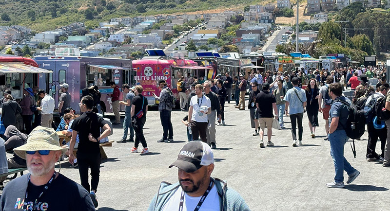 An array of food trucks in the back patio area of the Cow Palace.