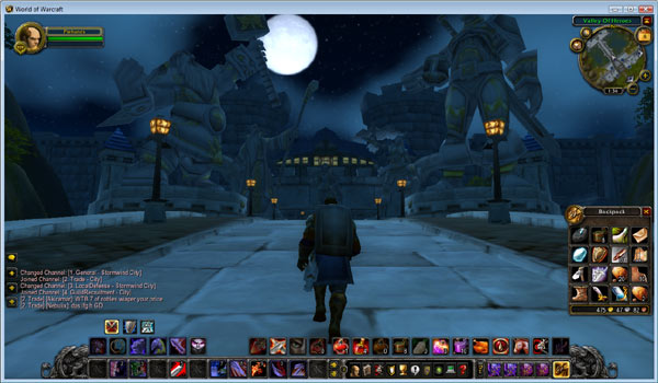 One of the first conversations I heard was from a guy looking to buy leather from other players. I also found the auction house (which I had seen before, watching my father play) and new trainers, traders, food, trinkets and food supplies. A fellow was offering to enchant my shield, but I couldn't hand it to him, because it was "soulbound" to me already. The city is really pretty big, and I've heard that there is a similar city below, in the sewers. A lot to explore, without monsters or treasure. The last place I visited was a florist. I at first assumed that the flowers must be used for spell casting. They didn't seem to have any attributes assigned to them (like an effect on armor rating or something). Only later did I realize these were here so that in-game players could give each other flowers! Amazing. I wonder if there is candy too, and valentines, and wedding invitations.